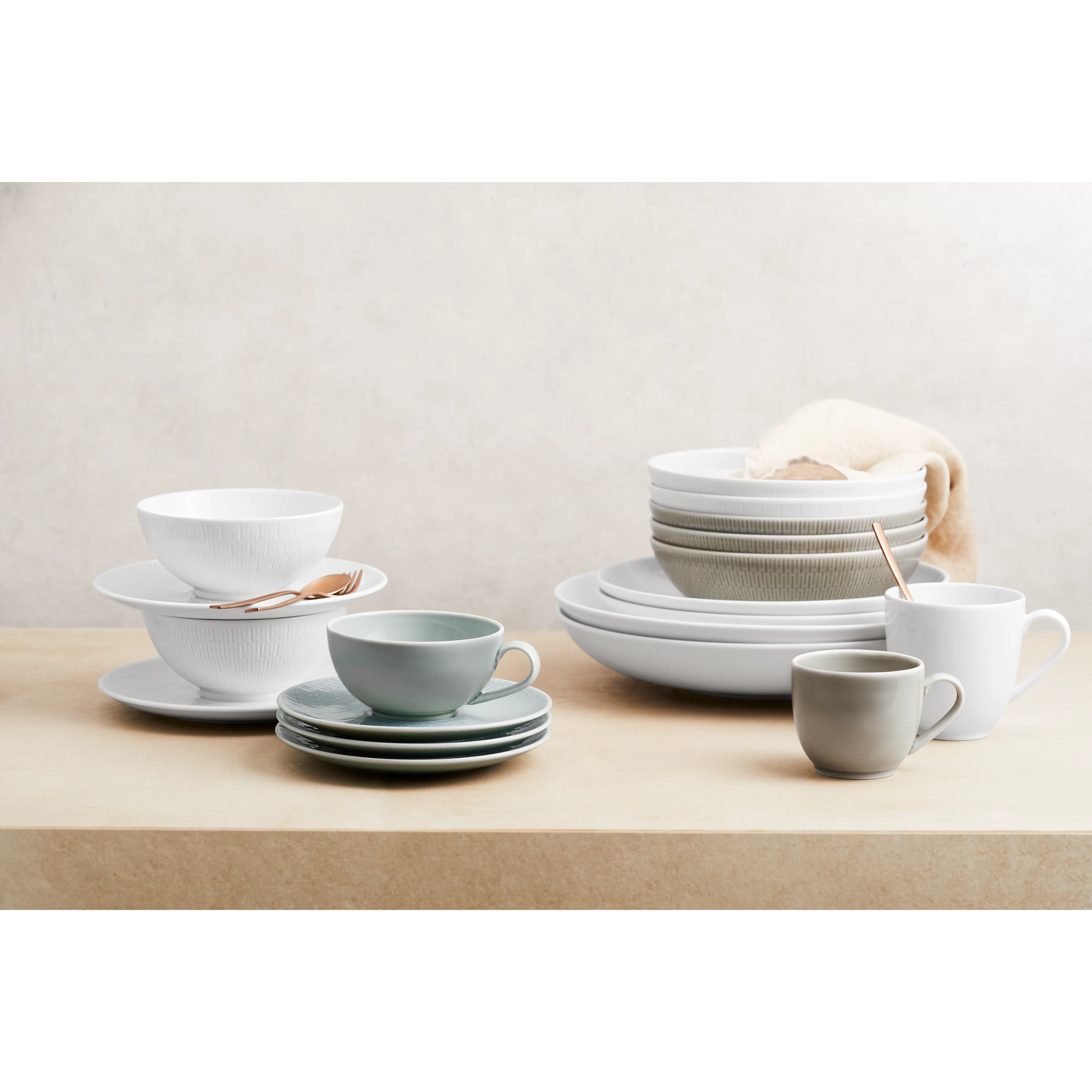 Die Bauscher Porzellan Serie Scope ist eine stilvolle und vielseitige Kollektion, die durch ihre einzigartige Gestaltung besticht. Das Geschirr zeichnet sich durch eine elegante Stäbchenstruktur aus, die dem Porzellan eine besondere Haptik und Optik verleiht. Es ist in zwei faszinierenden Glasurfarben erhältlich: Glow Gray und Sea oder in weiß mit Struktur, die jeweils eine moderne und gleichzeitig zeitlose Atmosphäre schaffen. Die Kombination aus den strukturierten Geschirrteilen und den dezenten Glasurfarben ermöglicht vielfältige Einsatzmöglichkeiten – egal ob für den Alltag, besondere Anlässe oder die professionelle Gastronomie.